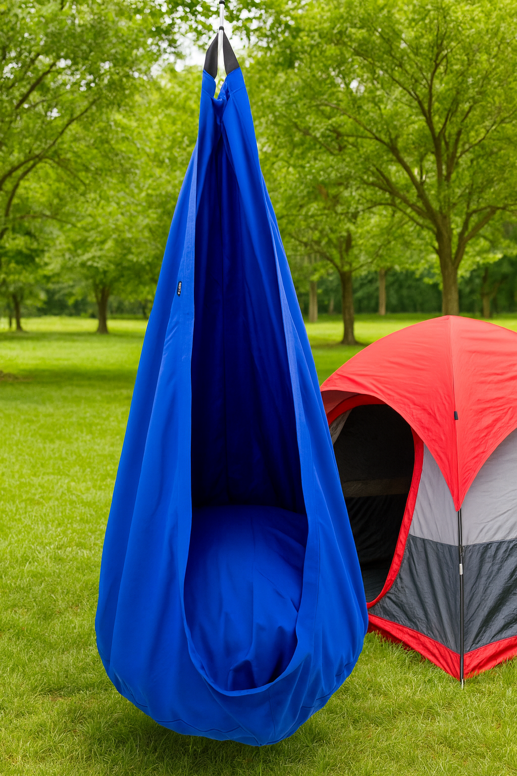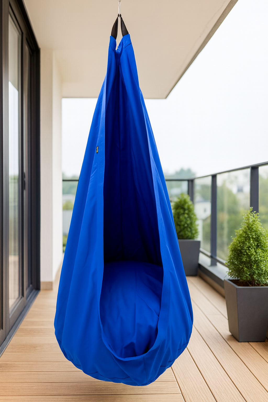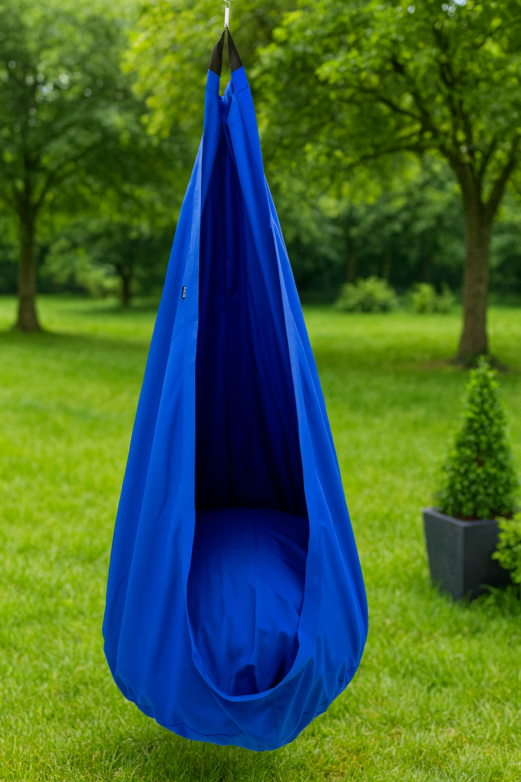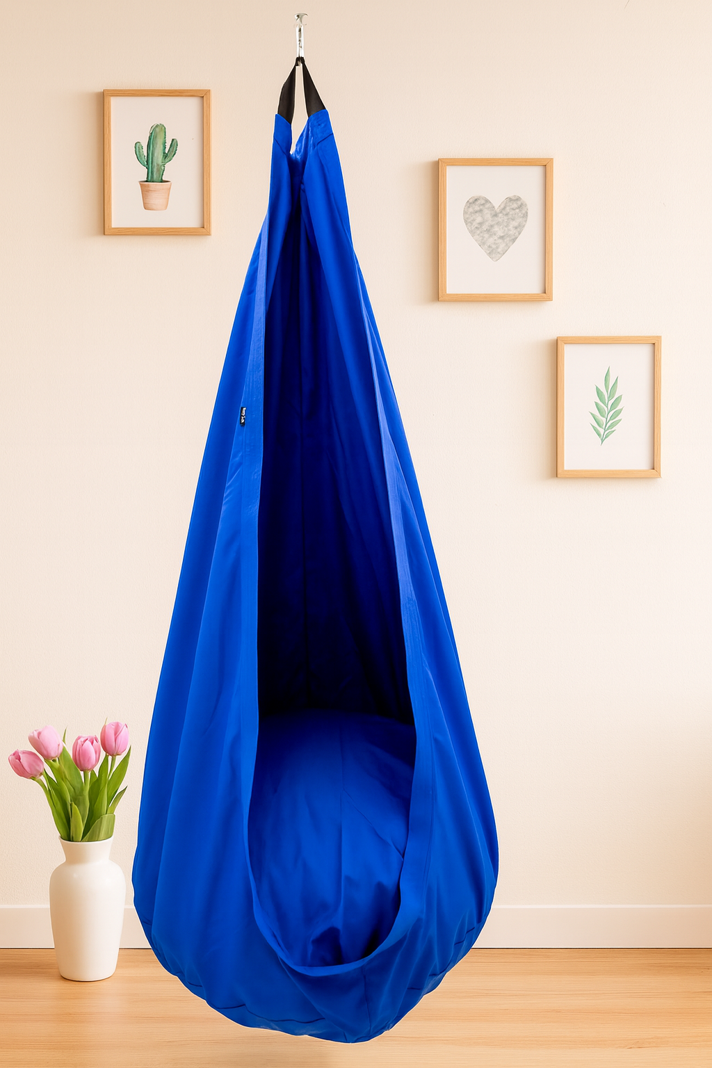 This stylish Blue Hanging Pod Swing is designed to create a calm and cozy spot anywhere inside your home. The swing features a soft, teardrop-shaped design with a comfortable padded base that provides perfect relaxation for kids and adults. It is shown in a clean indoor space with light décor, including floral accents and modern wall frames that highlight its vibrant blue color.